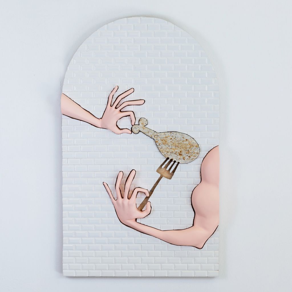 Ally Rosenberg, “Better in the flesh II,” 2023, Ceramic tiles, marble (granite), jesmonite, paint, OSB board, 98 x 59 x 7 cm. Presented by Dio Horia Gallery, Athens.